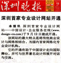 ……以匯集全國乃至世界優(yōu)秀的設(shè)計家、美術(shù)家,為企業(yè)形象和產(chǎn)品包裝服務(wù)的專業(yè)網(wǎng)站近日開通……網(wǎng)站最大特點是,將傳統(tǒng)商業(yè)設(shè)計與最新網(wǎng)絡(luò)媒介相結(jié)合,為目前國內(nèi)首創(chuàng)網(wǎng)絡(luò)化專業(yè)設(shè)計機構(gòu),也是深圳第一家專業(yè)設(shè)計網(wǎng)站,網(wǎng)站通過雙向服務(wù)功能……為企業(yè)和設(shè)計師之間架起了一座互動的橋梁……